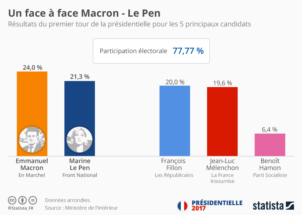 Découvrez en direct les résultats du premier tour de l'élection présidentielle française, en infographie, par région et par département. Le premier tour de l'élection du président de la république s'est tenu le 23 avril 2017 avec plus de 47 millions d'électeurs appelés aux . 7 679 493 · m. Le scrutin est marqué par une abstention de 25,4 %, taux important pour un second tour d'élection présidentielle, et par un record de votes . Liste des candidats, voix, % inscrits, % exprimés.