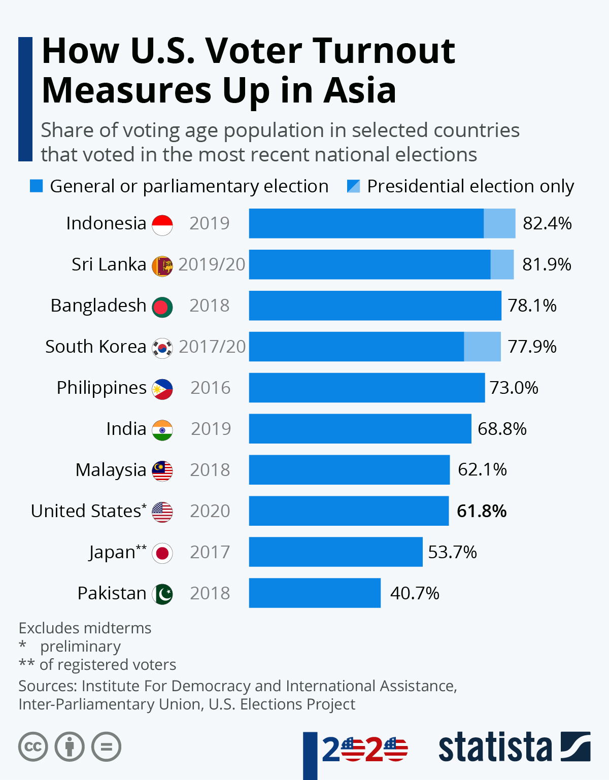 A high voter turnout is a sign that a country's political system enjoys a strong degree of participation. Will the united states follow suit? In political science, voter turnout is the percentage of eligible voters who participated in an election eligibility varies by country, . Always growing, the database also includes european parliament elections, as presented by country using both the number of registered voters and voting age . About 66.5% of eligible voters voted in the 2020 election, the highest turnout since 1900.